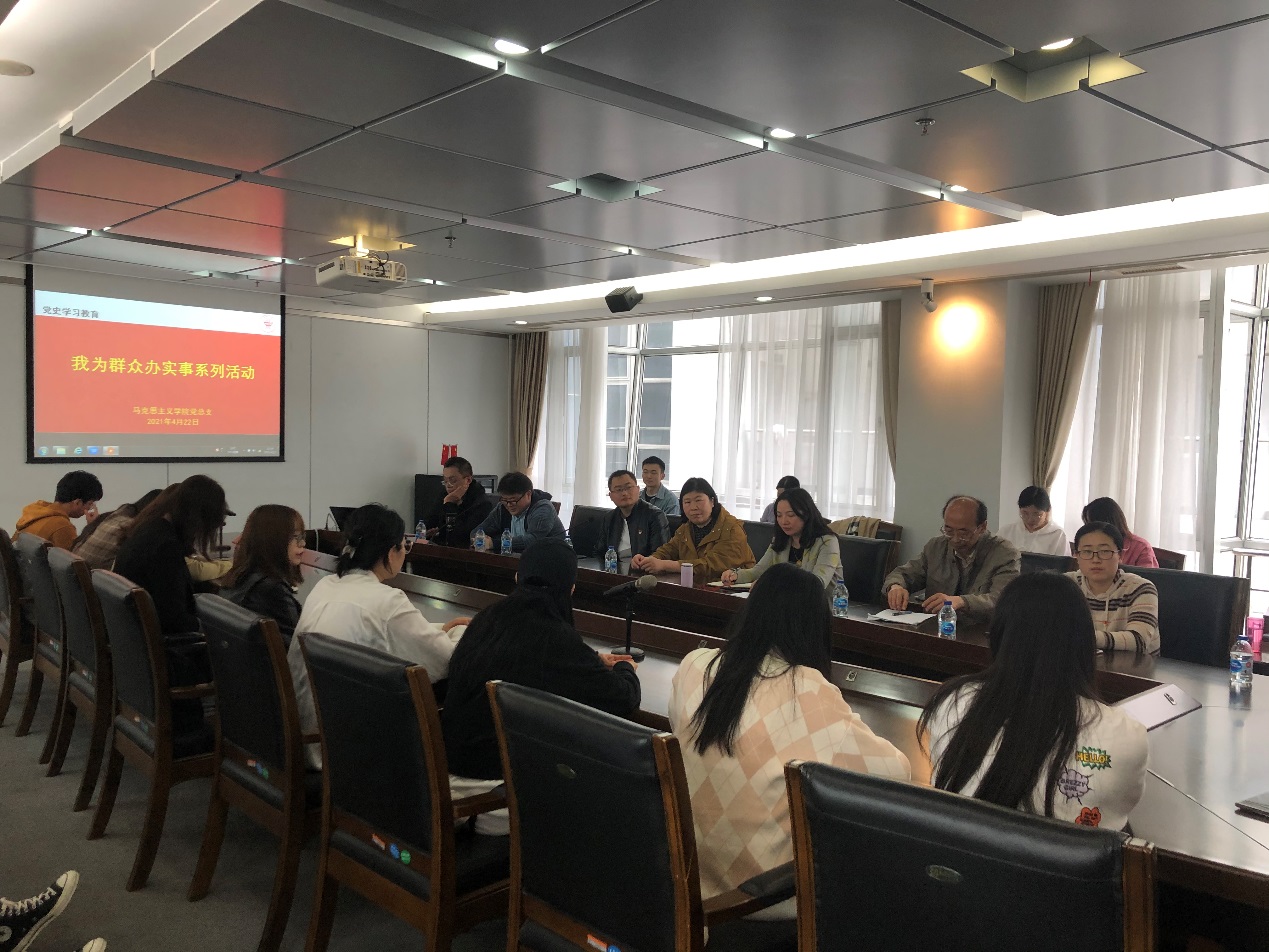 为深入贯彻习近平总书记在党史学习教育动员大会的重要讲话精神,深刻把握习近平新时代中国特色社会主义思想的精神实质、实践要求和为民情怀,进一步增强党员和师生学思践悟新思想的自觉,马克思主义党总支近日开展了“我为群众办实事”教工支部与学生面对面实事工程活动。学院党总支书记戴叶萍,教工第一党支部书记周林、第二党支部书记陆益军、第三党支部书记陈健,以及各教工支部代表教师和学院全体研究生参加此次活动。活动由beat365中文登录入口党总支书记戴叶萍主持。