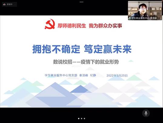 3月25日下午,beat365中文登录入口举办了“拥抱不确定,笃定赢未来”2022届毕业生就业主题活动,邀请校学生就业服务中心副主任秦泽峰老师、生涯教育部主管纪静老师分别带来了主题为“数说校招——疫情下的就业形势” 、“疫情当下如何克服焦虑顺利毕业就业”的讲座。学院党委书记戴叶萍出席,学院2022届毕业生及部分低年级同学共同参加,活动由辅导员于小越主持。
