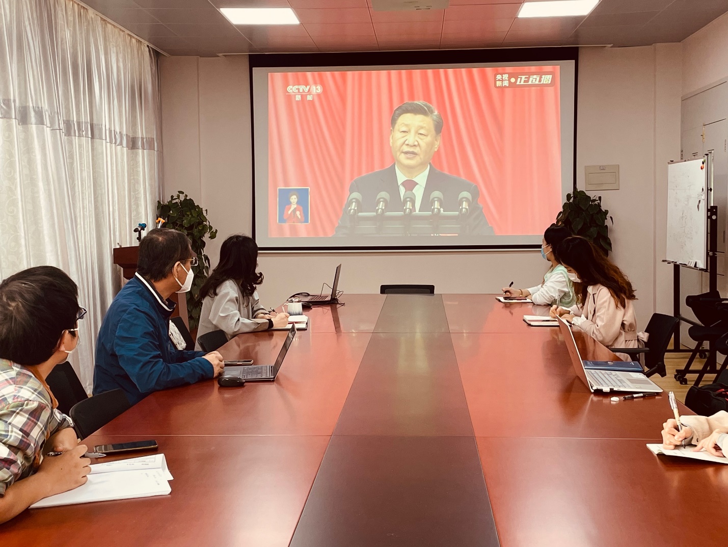 部分在校师生代表在会议室认真收看大会直播