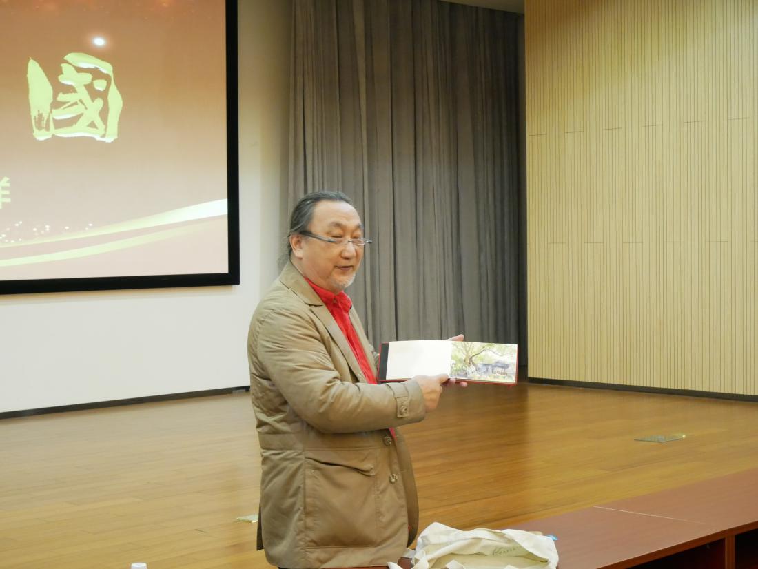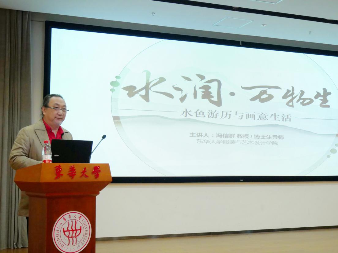 “上善若水。水善利万物而不争,处众人之所恶,故几于道。”水是有生命力而又低调的物质,水彩画以水为媒介,以彩为语义,在水和色彩的相互交融下,世间万物跃然纸上。12月14日,beat365中文登录入口服装与艺术设计学院教授、博士生导师、全国艺术专业学位研究生教育指导委员会委员冯信群,结合国内外游历写生经历,为同学们带来一场绚丽多彩的水彩艺术盛宴。 冯信群教授从水彩之美、水彩之趣、水彩之意三个方面对水彩艺术进行了阐述。他首先介绍了水彩画的发展起源,水彩画源于欧洲,盛于英国,是一门古老又年轻的艺术,水彩在中国的引入与发展对近代美术的价值观、审美观、方法论产生重要影响,与中国画传统用笔、气韵和意境相融合,蕴含着丰富的中国文化艺术精神,彰显中国气派。 冯信群教授结合自己在长征路、丝绸之路和尼泊尔、土耳其、意大利等国内外地区游历写生时的创作,将一幅幅水彩画背后蕴藏的生动故事娓娓道来。艺术来源于生活,冯老师围绕“艺术融入乡村”话题,生动讲述今年国庆期间在江西创作写生经历,用水彩展现乡间山水风景,将水彩与陶瓷相融合,实现水彩艺术的再创造,分享自己水彩创作的乐趣。