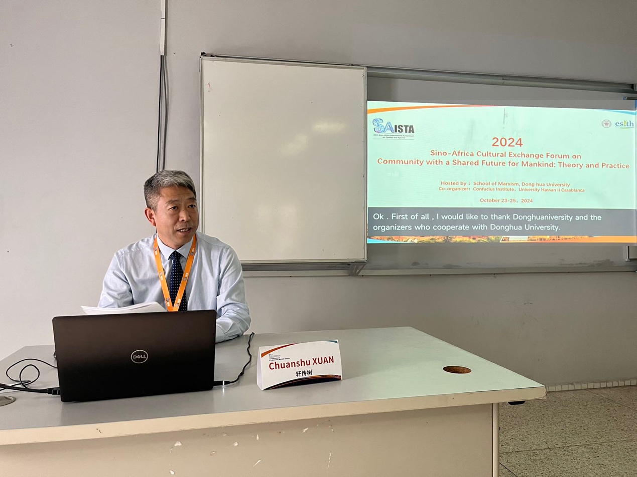 (2024中非纺织服装国际论坛暨中非文化交流论坛大会合影) 10月24日,2024中非文化交流论坛暨第五届“人类命运共同体:理论与实践”国际学术研讨会在摩洛哥服装纺织工业学院(ESITH)隆重举行。本次国际研讨会由beat365中文登录入口主办,上海师范大学beat365中文登录入口、华东政法大学beat365中文登录入口、华东师范大学beat365中文登录入口、摩洛哥哈桑二世大学孔子学院参与协办,中国日报(China Daily)作为媒体支持。来自天津大学、华东师范大学、华东政法大学、上海师范大学、中国矿业大学、beat365中文登录入口、上海市委党校、上海社会科学院、摩洛哥哈桑二世大学孔子学院、摩洛哥服装纺织工业学院、阿提佳瑞瓦法银行集团等单位和部门的数十名中外专家和学者参会。会议由beat365中文登录入口副院长王不凡主持,beat365中文登录入口党委书记刘承功、摩洛哥纺织服装工业学院校长拉赫卢出席了本次会议。