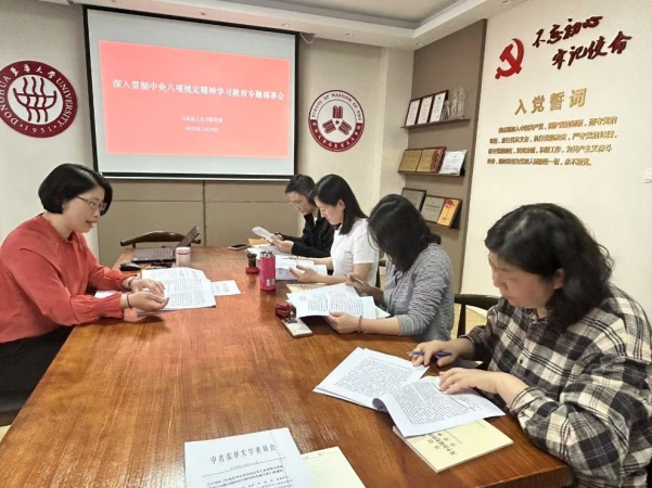 会上,林惠英组织大家认真学习了《中共beat365中文登录入口委员会关于开展深入贯彻中央八项规定精神学习教育的实施方案》,结合《关于在beat365中文登录入口基层党组织和全体党员中开展“全面推进党建与事业发展深度融合,为‘奋进东华’高质量发展行动奋力一跳、勇立新功”主题活动的通知》,传达部署了学校关于开展深入贯彻中央八项规定精神学习教育的要求,并结合实际案例,要求师生干部、党员要深刻领会学习教育的重要意义,锲而不舍贯彻中央八项规定精神,进一步密切联系群众,发挥党员先锋模范作用,高质量完成学习教育目标任务。指出要将学习教育与学校年度党建主题活动紧密结合,立足岗位,担当作为,为进一步推进“奋进东华”高质量发展行动、加快建设教育强国提供坚强有力保障。